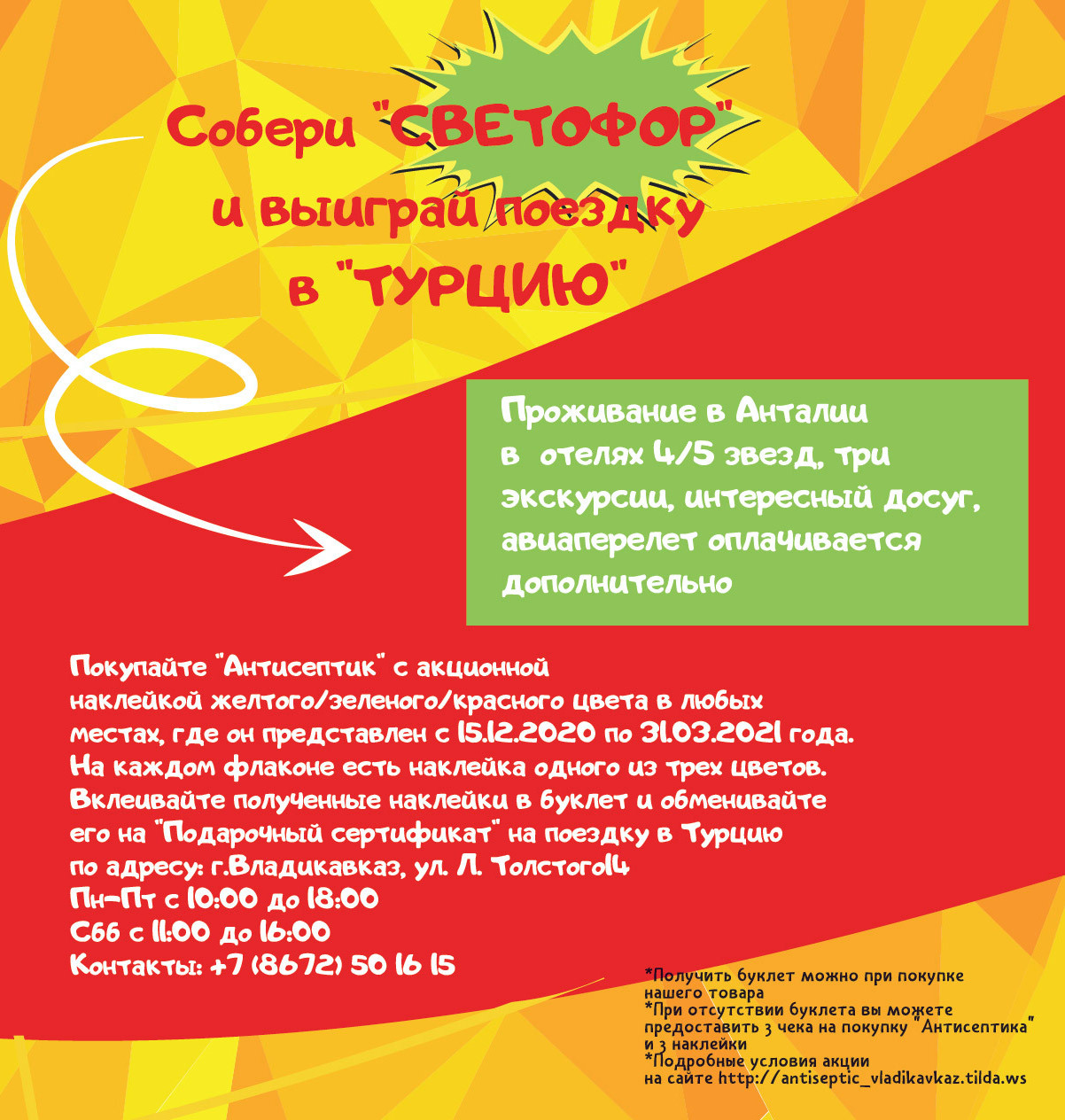 С 15 декабря 2020 года компания ООО "Парус1" запускает масштабную акцию "Собери СВЕТОФОР и выиграй поездку в Турцию". Покупай "Антисептик" с акционной наклейкой желтого/красного/зеленого цвета и получи поездку в Турцию в подарок. Акция продлится до 31.03.2021 года.