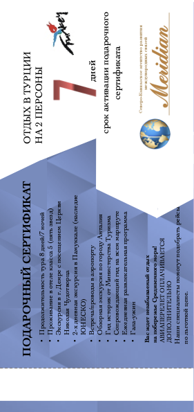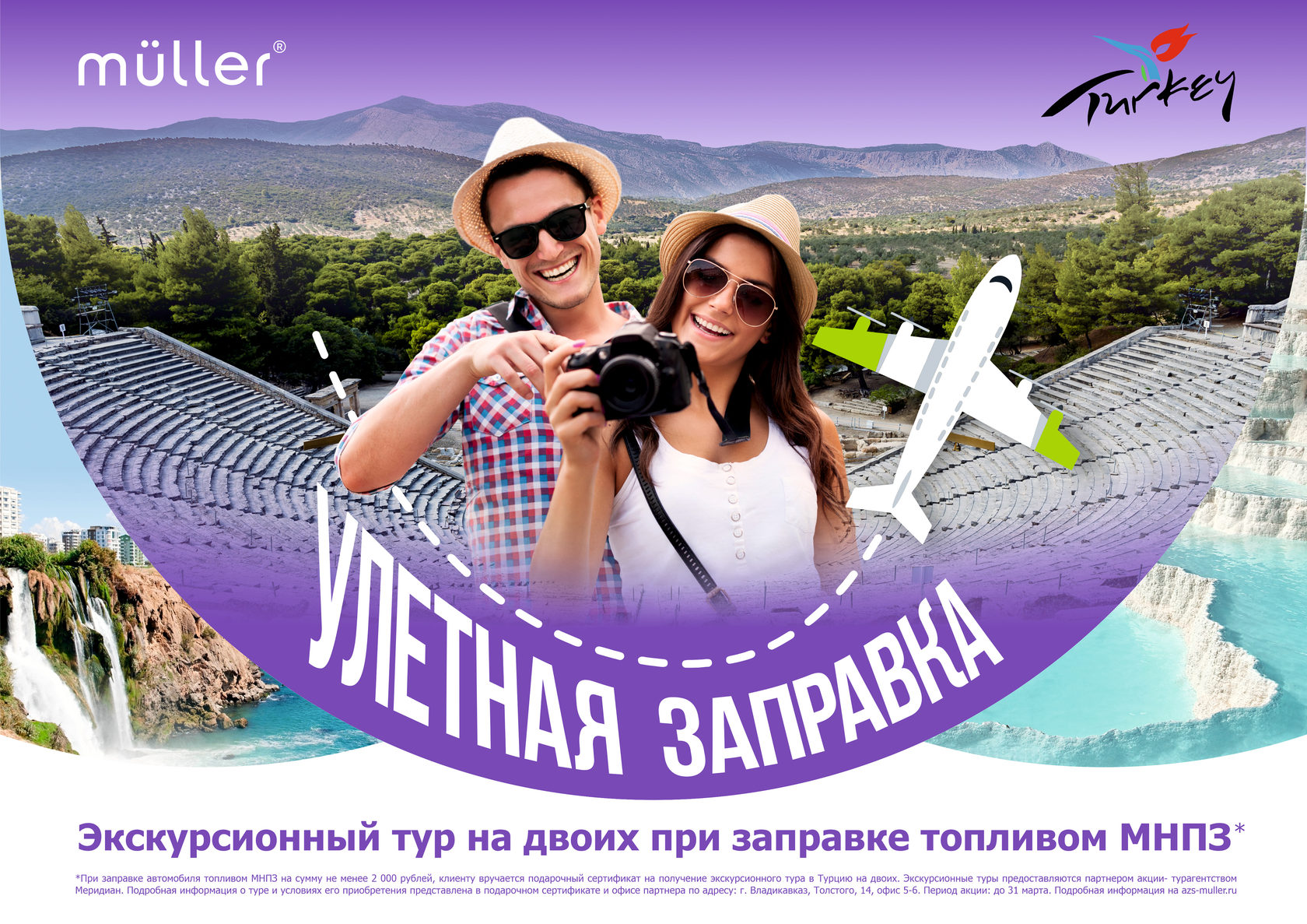 С 17 декабря 2020 года компания ООО "Парус1" совместно с сетью заправочных станций "Мюллер" запускает масштабную акцию. При заправке автомобиля топливом МНПЗ* на сумму не менее 2 000 рублей, клиенту вручается Подарочный Сертификат с ваучером экскурсионного тура в Турцию на двоих! В Акции принимают участие физические лица, осуществившие заправку автомобиля одним из видов топлива МНПЗ: 92 МНПЗ, 95 МНПЗ, ДТ МНПЗ.